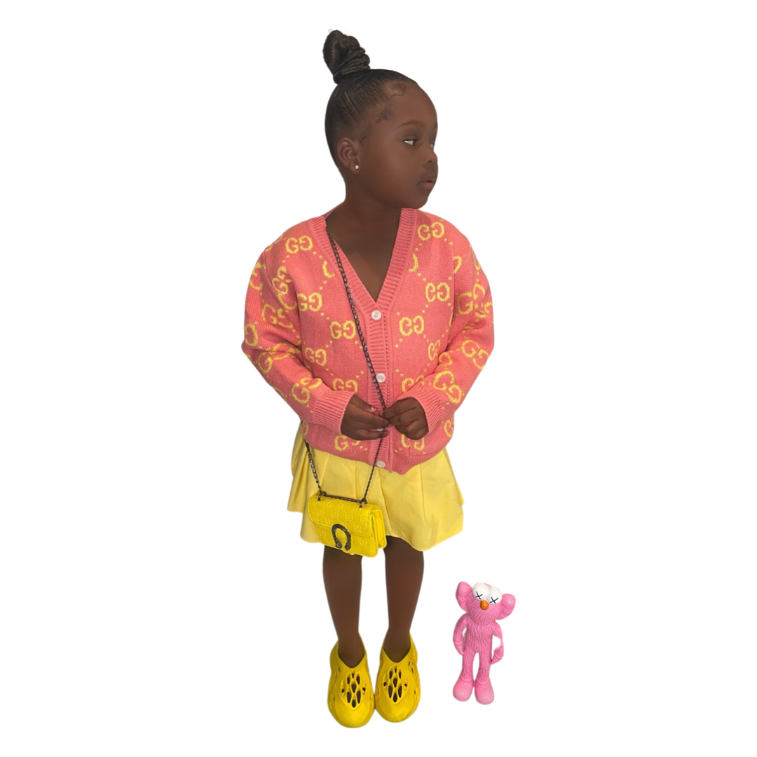 Pink/Peach sweater with yellow logos .
